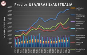 Como podemos ver en esta serie histórica hay una preferencia del consumidor por la carne vacuna que ante la escasez global presiona sobre los precios, mostrando que tanto Brasil, Australia y Estados Unidos han tenido aumentos de precios en los últimos tiempos.