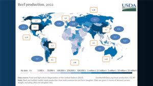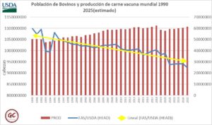 Para ir redondeando el punto, en el Mundo los stock bovinos caen, algunas presiones de políticas ambientalistas basadas en la ideología y no en la ciencia, por una parte, sequías por otra, y la falta de incentivos para aumentar la producción han contraído los stocks globales y esto atenta contra la producción anual.