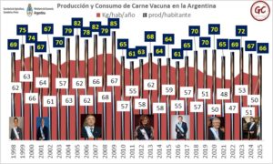 Luego por efecto liquidación de stock se logró aumentar la producción, lo mismo sucedió en 2023, la sequía hizo que se enviaran más animales de los habitualmente necesarios para cubrir la faena y producción de carne, un efecto climático llevó a liquidación y aumento de la producción de carne por habitante, por carácter transitivo aumento del consumo.