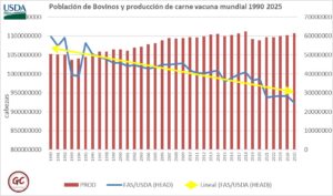 La población mundial de bovinos ha disminuido en el mundo, la producción individual ha aumentado pero no lo suficiente para atender una demanda incremental.