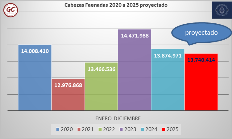 Teniendo en cuenta que los primeros 10 meses de cada año acumulan representan habitualmente el 83 % de la faena total del año, podemos predecir que la faena anual finalizará aproximadamente en esta cantidad de cabezas: