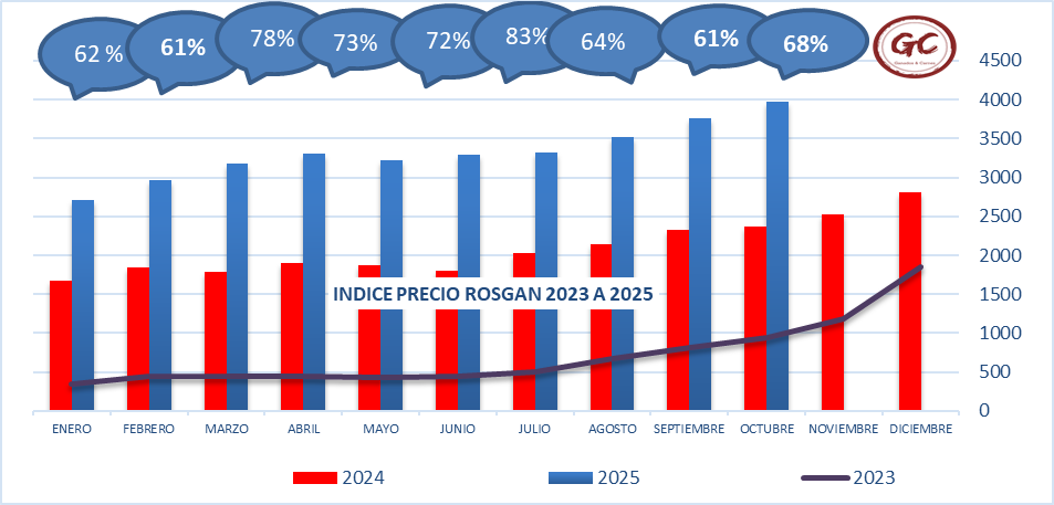 La diferencia interanual se asentó en torno al 65 %, con picos del 83 %, esta tendencia será similar a la de años anteriores, menor oferta en los últimos 2 meses del año hacen que los precios se tensionen con subas.