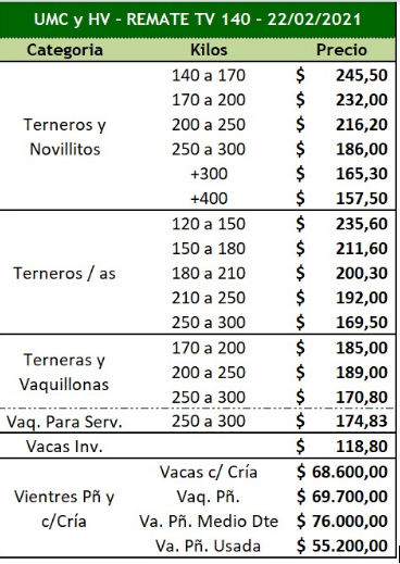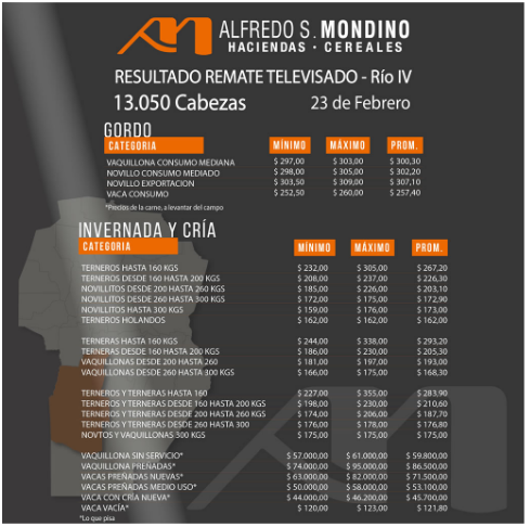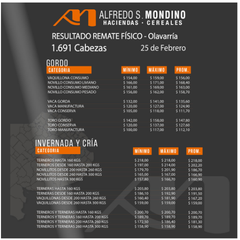 Alfredo S. Mondino consiguió el máximo de precios en su remate del 23 de Febrero a $ 355, promedios de livianos tanto machos como hembras con valores por encima de $ 290, intermedios entre $226 y $210, mostrando que el ternero liviano tiene una gran expectativa a la suba y devaluaciones futuras, en tanto que el negocio se encuentra un tanto más estable.
