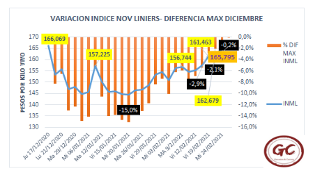 Con el gordo en Liniers que demoró 11 semanas en recuperar el valor de Diciembre del 2020, por una parte, las cotizaciones del dólar donde el oficial sube y las demás cotizaciones bajan lleva a una espera que demora la toma de decisión, todo esto con un Enero y Febrero llovedor que permite que haya mejorado la oferta forrajera, el resultado prorratear las ventas dilatando los ofrecimientos a lo largo del año.