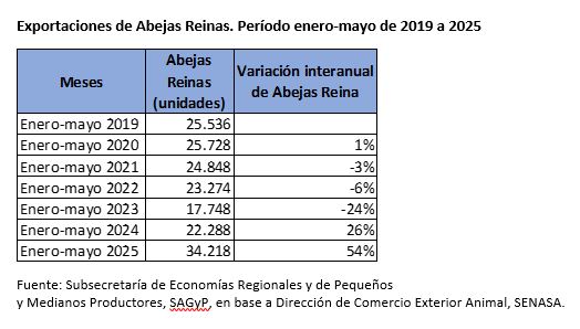Cabe destacar que la cantidad exportada durante enero-mayo 2025 supera en 49% al total exportado durante el año 2024 completo y en 89% al total exportado en 2023, cuando la cantidad de abejas reina totalizó 18148.