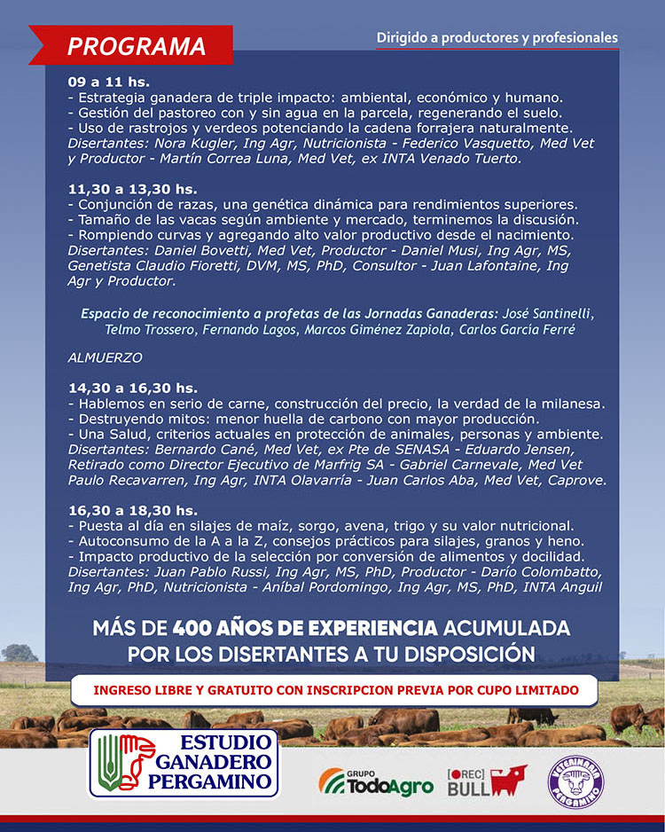 Organizadas por Estudio Ganadero Pergamino, las jornadas contarán con el respaldo de instituciones como INTA, Grupo TodoAgro, y empresas del sector, en una propuesta que combina conocimiento técnico, innovación productiva y cultura regional.